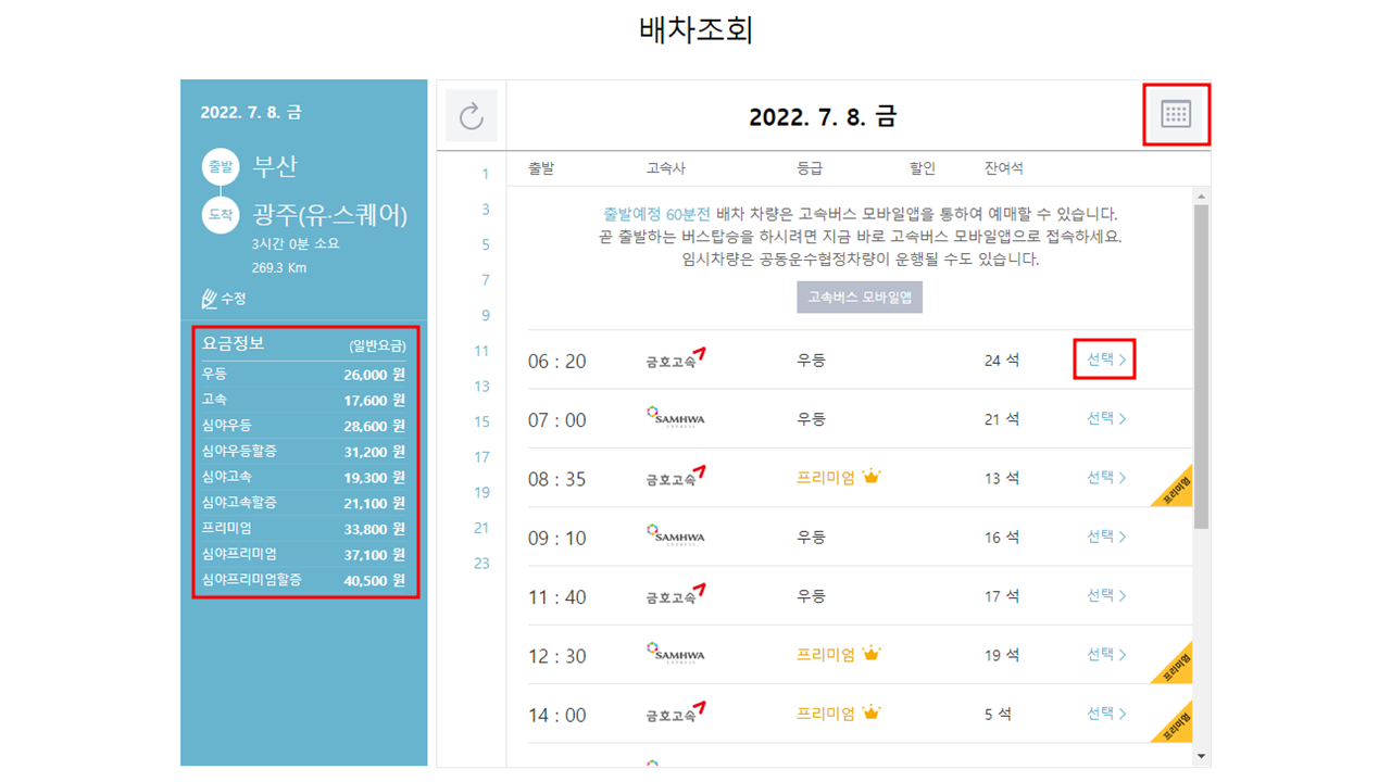조회하기를 누르면 사진 속에 보이는 것처럼 가능한 시간대와 등급에 따른 요금을 확인할 수 있다.