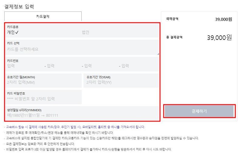 개인카드인지 법인카든지 선택 후 순서대로 입력칸을 작성한다.